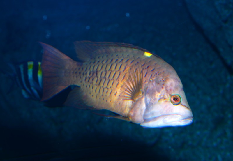 深海大水槽のエビスダイです。最近よくアクリルの観覧面に近寄ってきます。赤い体に大きな眼が可愛い魚なので、いつもは近づいてくると正面からの写真を撮っていました。今朝はちょっと構図を変えて斜め下を向いた横顔を撮ってみました。この表情もなかなかいい!!眼力がすごいです!