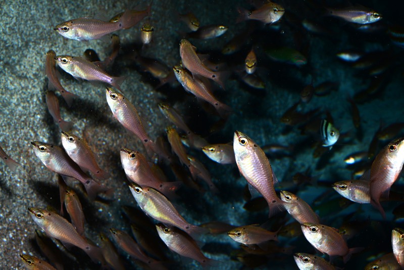 外洋水槽に、窪津大敷で収集した清水サバことゴマサバやクサヤモロなどの若い個体の群れが展示されました。大敷網で収集したものを近くに借りている生け簀で養生したあとに、運んできたものです。今日の写真は、ゴマサバとクサヤムロが混ざった群れなのですが、区別がつきますか?鰓蓋の上にのほうに黒い斑紋があるのがクサヤムロで、良く見ると体に青いラインが走っています。ゴマサバにはこの黒斑はありません。