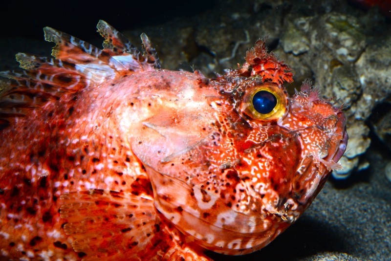 深海のコーナーで、オオコシオリエビのいい写真が撮れたと思ってようく見てみると、後ろには綺麗なイソギンチャクが写り込んでいて、その横にはユメカサゴがイソギンチャクに寄り添っていました。全くバックを気にせずに、オオコシオリエビがいい場所にいたのでシャッターを切っただけなのですがビックリです。オオコシオリエビもいい横顔をしています。