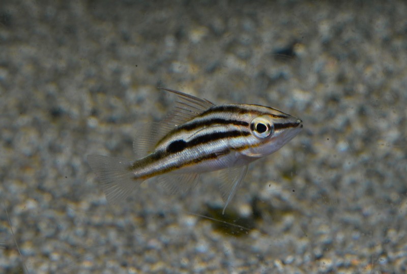 竜串湾大水槽のタカノハダイです。土佐清水周辺に住む魚のうちでも温帯系の代表種です。体の模様が鳥のタカの羽の縞に似ている所からの名前です。この時期、磯や漁港にはタカノハダイの数センチの稚魚が現れます。この稚魚を見つけると春の訪れを感じさせてくれます。稚魚は二枚目の写真のように少し体高があり、薄いジュラルミンの板のような体で、海底や岸壁に止るようにじっとしています。