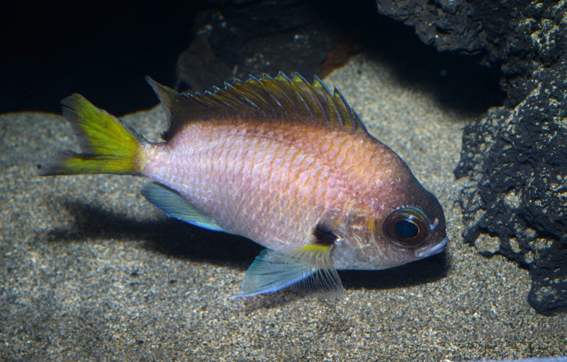 今朝も足摺の海のコーナーから、ムナテンベラの幼魚の素晴らしい体色が撮影できました。何と表現したらいいのでしょう、少し淡い藍色?紺色?濃い青色系の素晴らしい体色に染まっています。そして背鰭の斑紋と黄色の腹びれが良く目だちます。大きさは全長で8㎝程まだまだ若い個体です。成長すると18㎝程になるようで、体色の変化がまたみられそうです。
