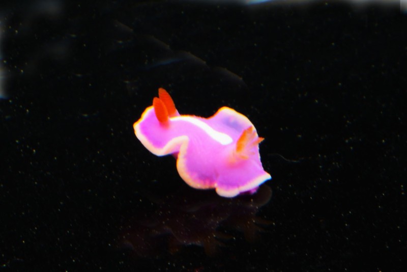 ウミウシコーナーのシンデレラウミウシが良いポーズをとっていましたよ。いかにもウミウシというポーズ。とても綺麗です!この個体は大きいので、海中でも良く目立つことでしょう。でもこの体色は「私は貝殻を無くした貝で美味しそうですが、食べるとすごく不味いですよ!」と警告しているのです。