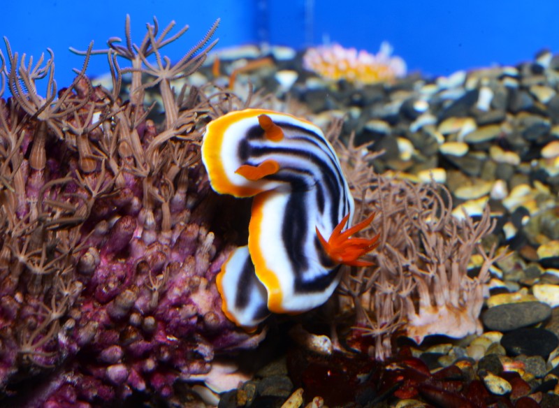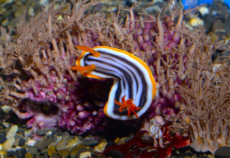 ウミウシコーナーに綺麗なウミウシが展示されています。クロスジウミウシです。その名のとおり、体には細くて黒い筋が沢山並んでいます。その筋は背中だけではなく、二枚目の写真のように体の横にも沢山並んでいます。全長5㎝位で良く目だちますので、探してみてください。
