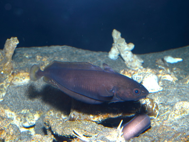 深海コーナーのチゴダラです。いつも水槽の底砂に掘られた穴の中に隠れていて、なかなか姿を見せてくれません。時折、思い出したように穴から出てきては、周りをパトロールするかのように泳いだかと思ったら、また穴の中へ。水深1000mもの深海からも報告されていますが、幼・稚魚は水面下や磯の潮だまりでも見ることができます。東北地方では「どんこ」と呼ばれ、肝臓が美味しく鍋やみそ汁の具、棒に頭を下にして刺して焼いたものが賞味されます。