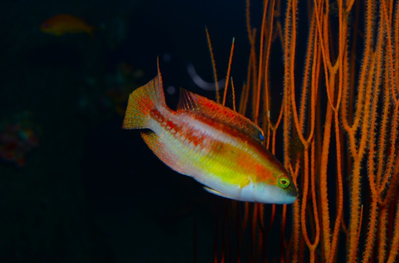 サンゴコーナーで、エダムチヤギの群体を出たり入ったりしていたフタホシキツネベラの若魚です。エダムチヤギのオレンジ色の林の前で、いい感じに撮れていますね。全長60㎝にもなるキツネベラやもっと多きくなるタキベラの仲間ですが、成長しても10センチほどの小型種です。淡い色合いの、やさしい感じがするベラですよ。