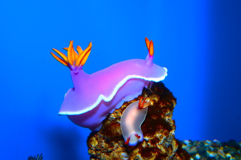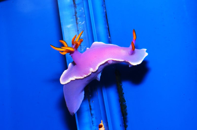 ウミウシコーナーに大きなシンデレラウミウシが展示されています。良く見かけるのは全長5~6㎝程の個体ですが、この個体は体を伸ばすと10㎝位はあるかなぁ。最大級のシンデレラウミウシです。桃紫色の体に、橙色の触角と鰓、とても綺麗なウミウシです!一枚目の写真に一緒に写っているウミウシと比べると、その大きさが判ると思います。