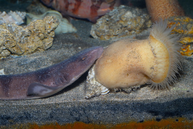 深海コーナーで、ナヌカザメの幼魚がイソギンチャクに下顎を載せていましたよ。閉じ気味の目の奥には金色の瞳が。なんかうっとりとしているような。イソギンチャクは嫌がっている様子もなく、綺麗に触手を伸ばして開いています。