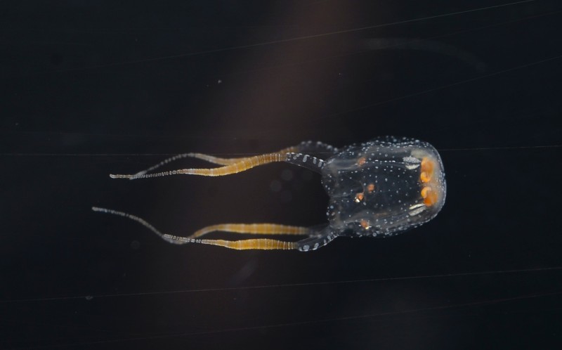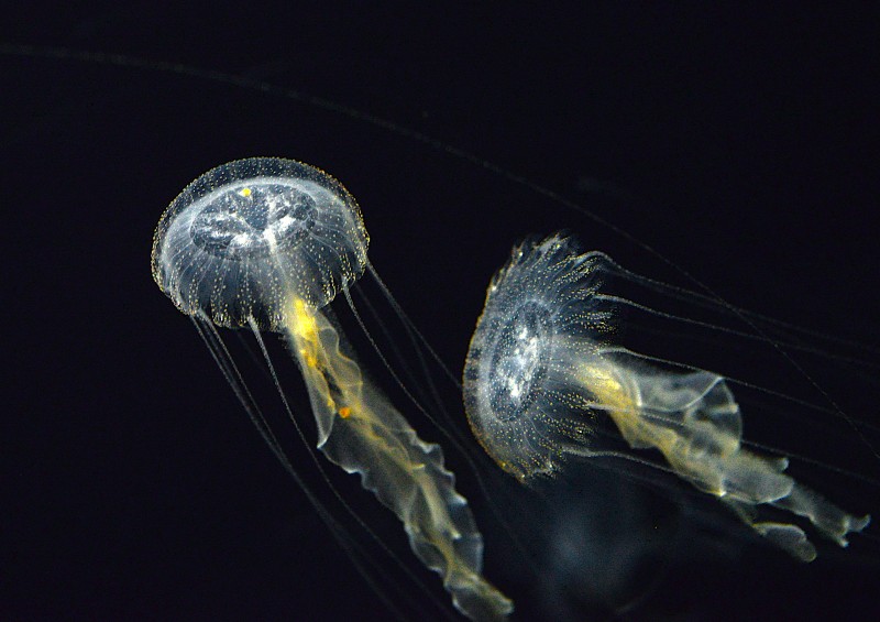 アマクサクラゲの綺麗な写真が撮れました!水槽の照明だけではただの青白いクラゲなのですが、光の当たり方によっては、素晴らしい写真になります。このクラゲは触手だけではなく傘の表面にも猛毒の刺細胞があり触ると危険です。写真の傘にある小さな黄橙色の点々がその刺細胞です。