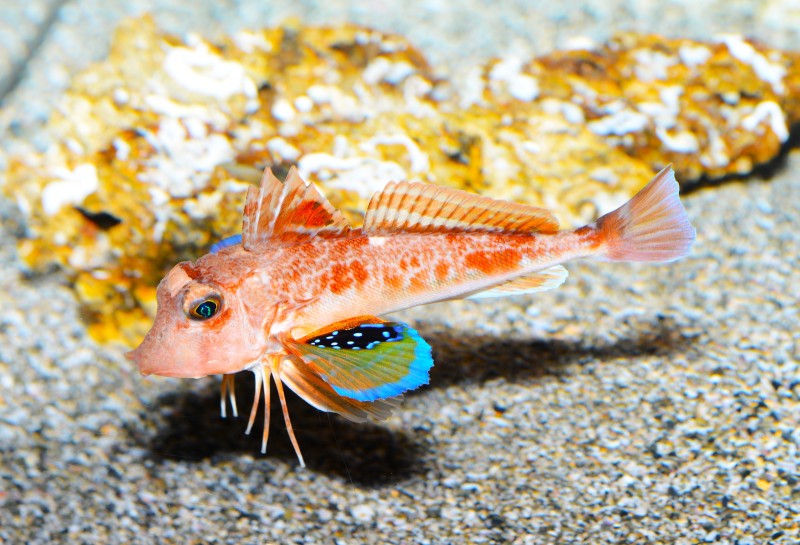 足摺の海のコーナーのオニカナガシラのいいポーズの写真が撮れました。いつもは水槽の底砂の上に鎮座しているのですが、フワッと浮き上がったところをパチリ!胸鰭にある3本の足のような遊離棘が綺麗に伸びています。そして美しい胸鰭の模様もしっかりと見えています。眼の輝きも素晴らしい!