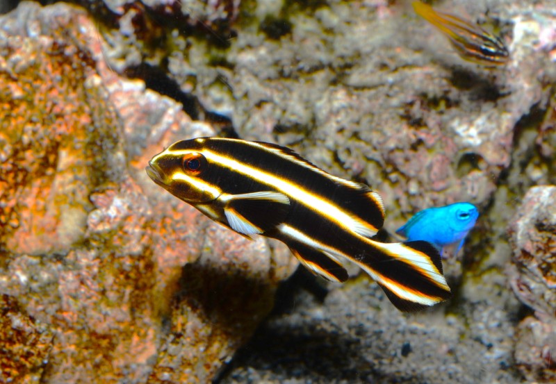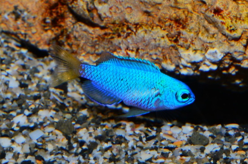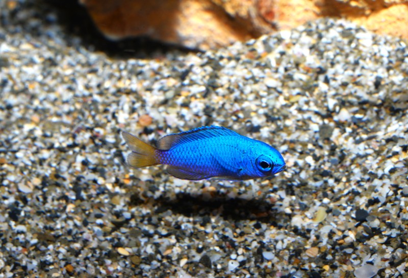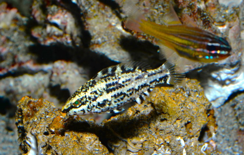 濃い朱色の体の胸鰭以外には淡い水色の小さな斑点が散りばめられ、涼し気な模様ですね。意外と臆病で、水槽の岩陰に潜り込んでいることが多く、やっと出てきたなと思ってカメラを向けると、サッと隠れてしまいます。1匹のオスが数匹のメスを従えたハーレムをつくり、大きな縄張りを作ります。