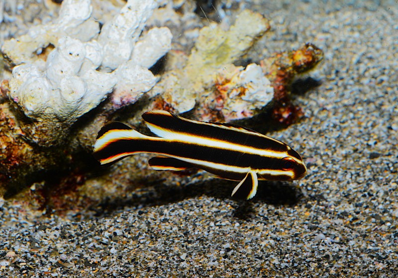 先日紹介したソラスズメダイの幼魚と同じ水槽に展示されているヒレグロコショウダイの幼魚です。シロと黒褐色の縞模様が素晴らしい!例年は採集に行くと、一匹見つけるのがやっとの魚なのですが、今年は一回の採集で数匹がまとまってとれました。こんなにまとまって獲れるのは珍しい。今年の海はなんか変です…