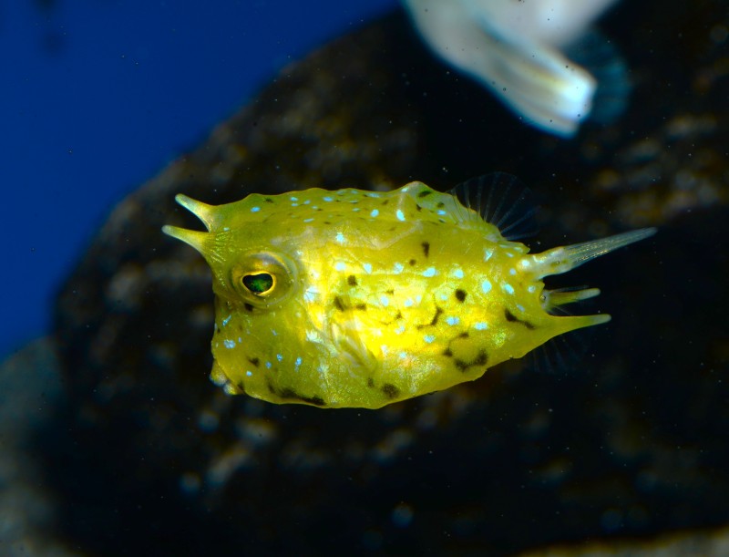 足摺の海のコーナーに小さなコンゴウフグも幼魚が展示されています。体長で4㎝弱の小さな個体です。コンゴウフグは稚魚の頃には、まだとお尻に生えている一対の角はなく、黄色いサイコロのようです。ドローンのように上下左右に移動する姿がとても可愛いです。黄金色の体に青白色の斑点も印象的ですね。