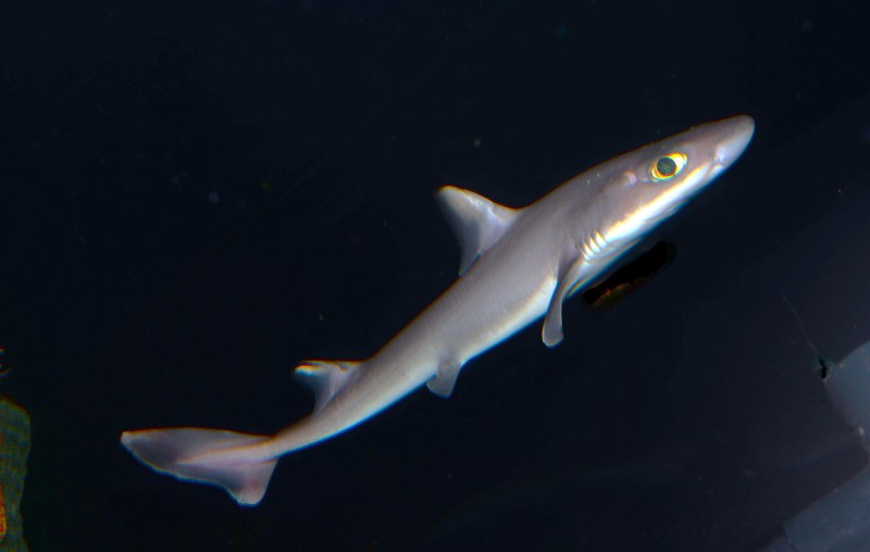 深海コーナーに入ってすぐ右の水槽に展示されているツノザメの仲間です。二つある背鰭の前縁に棘があるのが特徴です。深海大水槽にいるフトツノザメ比べると、鼻先の感じがちょっと違うかなと。その眼の瞳は大きく、深海に住むサメだなぁと感じさせてくれます。