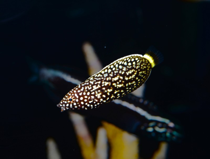 足摺の海のコーナーには、今熱帯性の魚たちの幼魚がぞくぞくと展示されています。今日紹介するのはクロフチススキベラの全長で4㎝程の幼魚です。体中に白い斑点が沢山あり、眼の存在を判らなくしていますね。成長するに従い、体の模様が変化していくので、どんな模様になるか楽しみです!写真はちょっと口を開いたところで、シャッターを切りました。