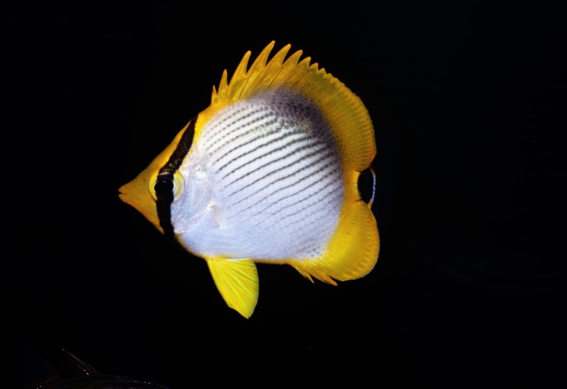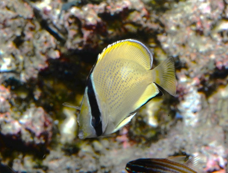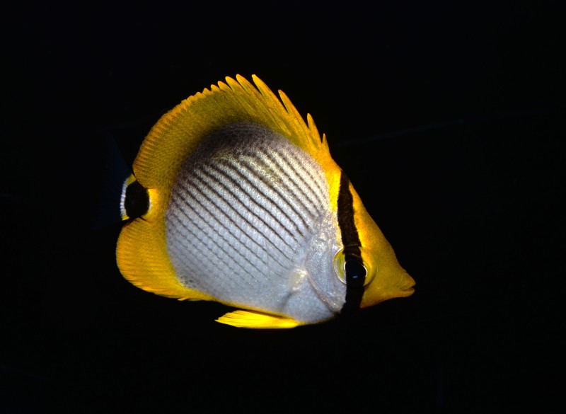 足摺の海のコーナーのようh魚たちから今日は、アケボノチョウチョウウオの幼魚です。一枚目の写真の、ちょっと下向きの所を斜め上から撮影した、このポーズが魚たちの姿が一番綺麗に写るじゃないかなと思っています。なかなかいい感じで撮れないんです。真横からだと二枚目のように標本的になってしまって…体を走る斜めのラインがとても綺麗ですね!そして、いい顔をしています!!