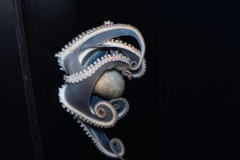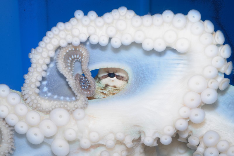 深海コーナーのタコ、アカシマダコと仮に呼ばれていますが、まだ正式な学名や和名はついておらず、研究中なのです。そのタコ君、最近は朝、アクリル面に張り付いてこちらを覗いている姿を良く見ます。そんな顔をパチリ!穏やかな顔つきで、頭のように見える胴体部に白い縞が出ているのがよく判ります。