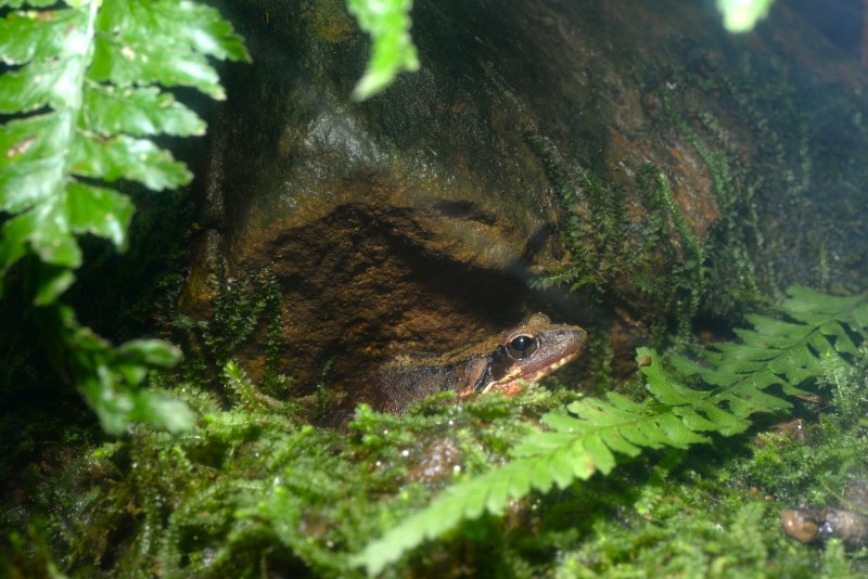 今朝、足摺の原生林のカエルの水槽を覗くと、綺麗な瞳がチラッと見えました。よーく見ると、ニホンアカガエルが。緑の植物に囲まれて、じっとしていました。そっと写真を撮って、いったん水槽から離れてもう一度覗いてみたら、もうその姿はありませんでした。