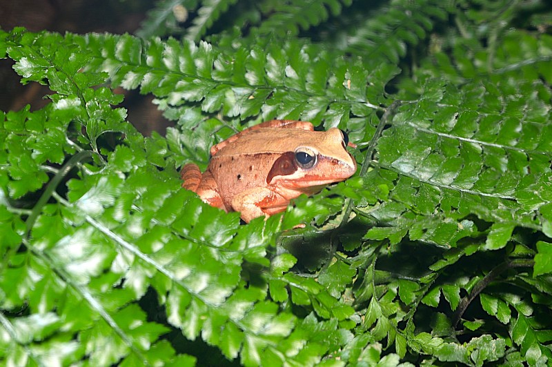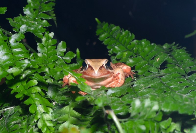 18日に紹介した、足摺の原生林のニホンアカガエル君、今朝はシダの上でこちらを見ていました!正面からと横から、その姿を撮影しましたよ。大きく真ん丸の眼、可愛いですね!