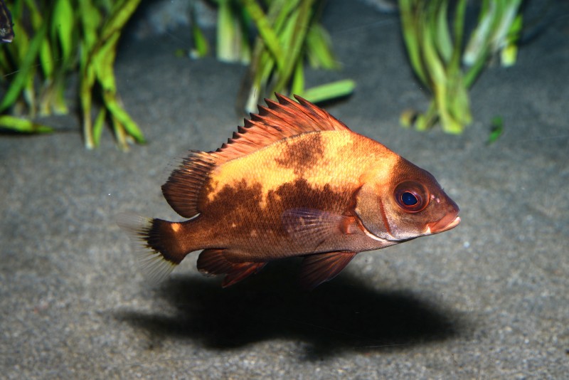 「ざまな深海」展よりアカカサゴ。浅瀬に住むカサゴの仲間に比べると、やさしい顔をしたカサゴです。水深500mの深海底からも知られています。からだが硬くて頑強な感じがするカサゴの仲間にしては、体は柔軟で、骨も弱いようです。深海の水圧に耐えるために体が柔らかくなったのでしょうか?生きている姿に出会う機会は少ない魚なので、この機会に是非ご覧になってください。