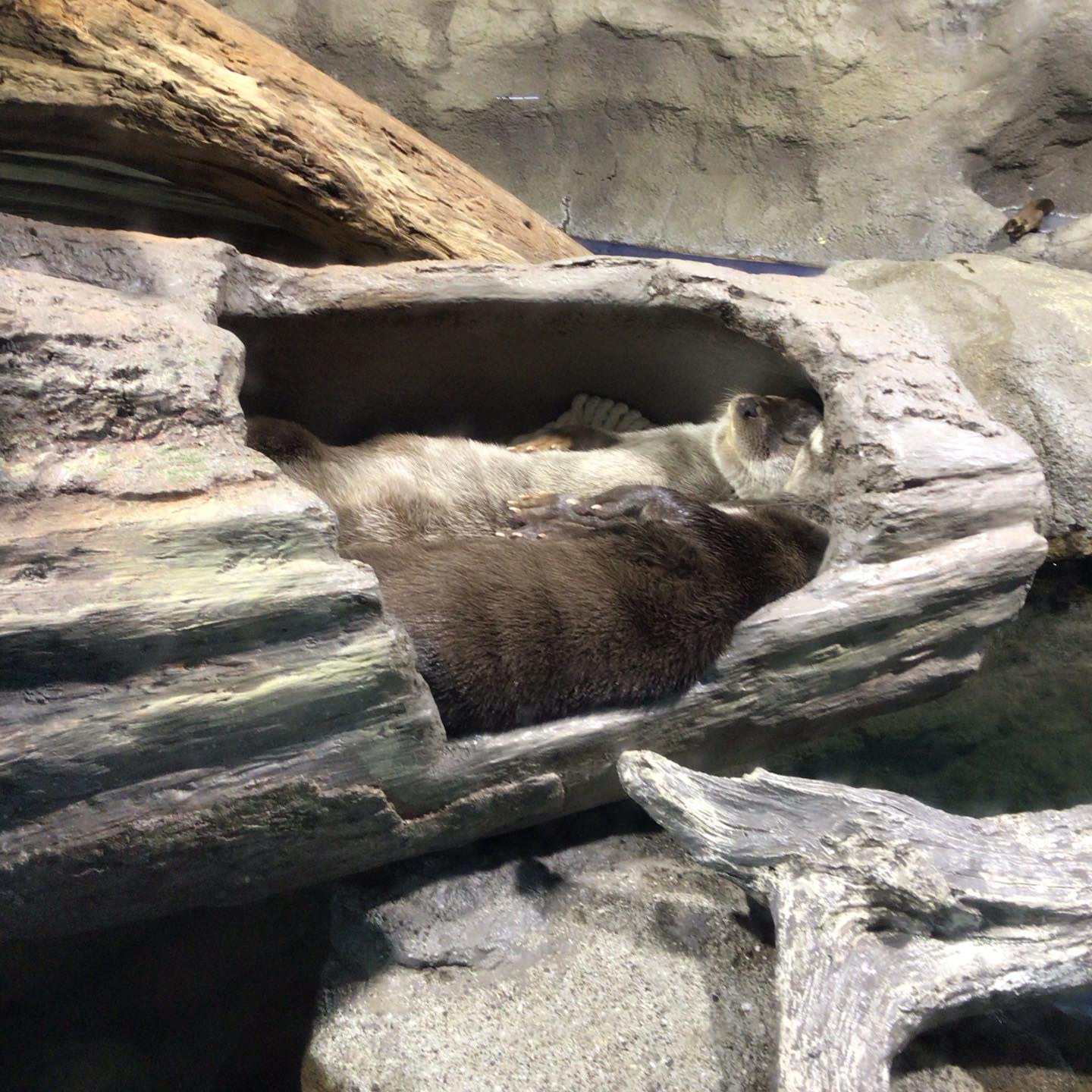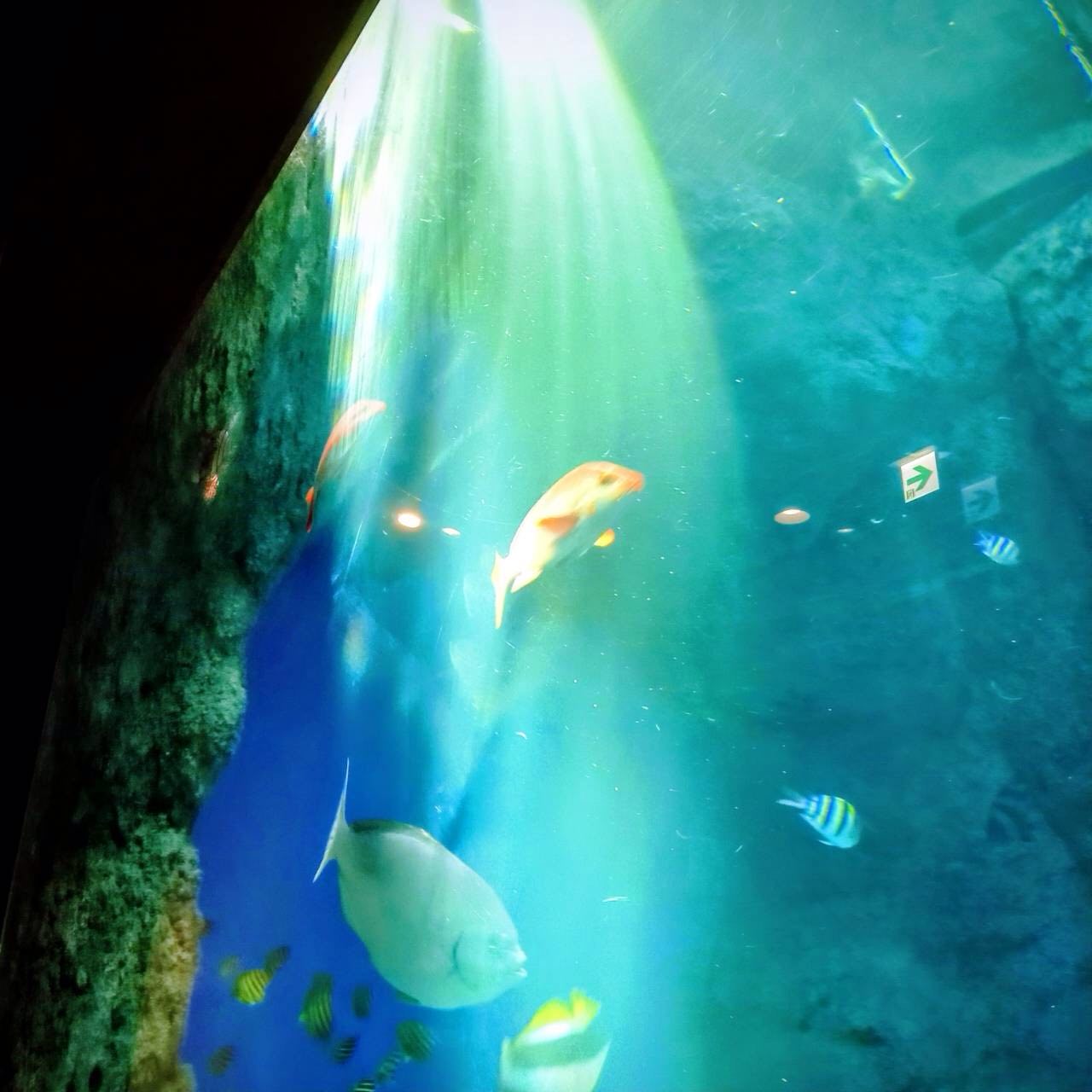 ワモンダコがブルーのアクリル面に張り付いて、こちらを見ていました。近づくと、腕を大きく広げ何やら威嚇しているようです。その腕と腕との間の膜も大きく広がりバックのブルーが透け、なんか地球外生物のようでしたよ。