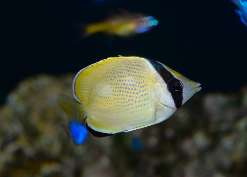 足摺の海のコーナーのゴマチョウチョウウオの幼魚です。淡い黄色の体にはゴマのような小さな黒点が。数日前に紹介したアケボノチョウチョウウオの時に書きましたが、一枚目のポーズがいい顔だとおもいます。真横からの写真は、いい眼をしていますが、やはり少し動きがあるほうがいいですね。