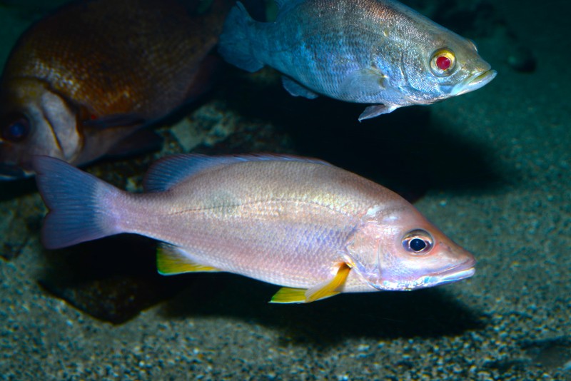 SATOUMI2階の河口の水槽で、クロホシフエダイを撮影したら、その上にアカメが写り込んでいました。アカメの眼はルビーのように赤く輝いてとても綺麗です!なかなかアカメの眼を輝く赤に撮るのは難しいのですが、偶然に綺麗に写っていました。主役のクロホシフエダイより、アカメに目が行ってしまいますね。