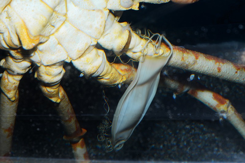 深海コーナーのタカアシガニの足に何かが絡みついていました。同じ水槽で展示されているナヌカザメの卵です。この卵の四隅にはコイル状の細い突起があって、自然界では、これで海底の岩や海藻に絡みつき、そこで発生を続けます。卵は10センチほどもあり、海岸に打ち上げられてものを“人魚の財布”と呼ばれることがあります。約一年くらいをかけてゆっくりと発生し、親と同じ形をした子ザメが誕生します。