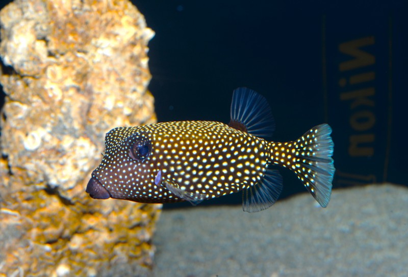 足摺の海のコーナーにクロハコフグが展示されています。同居しているハコフグやミナミハコフグの幼魚は黄色の体に黒点が散在しているのですが、クロハコフグは黒い体に白点が散在しています。黒いハコフグ、なかなか渋い美しさがありますね。