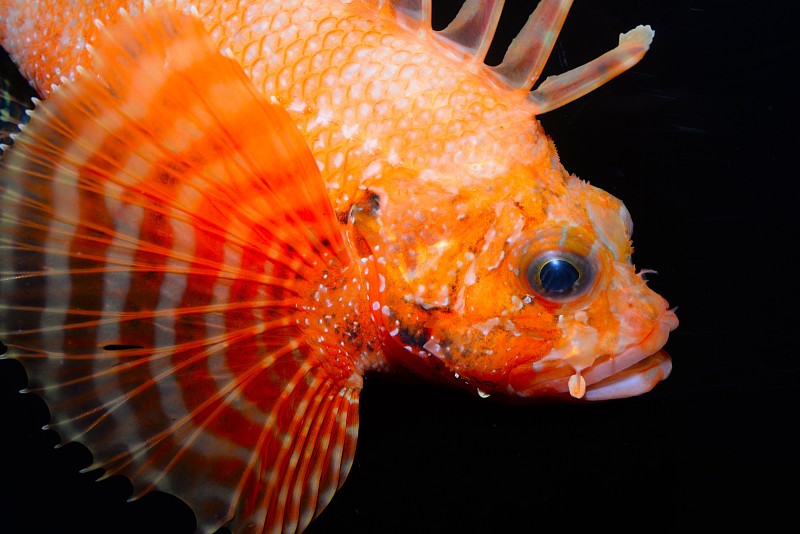 足摺の海のコーナーのキミオコゼです。長く伸びた胸鰭の鰭条が素晴らしい!扇のような、鳥のような。この種もミノカサゴの仲間なので、綺麗な鰭の棘には毒があり、刺されると大変なことになります。