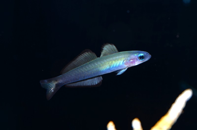 足摺の海のコーナーのサンゴトラギスの幼魚。華奢な体の割には大きな眼が印象的です。その可愛らしい眼をまずは正面から。警戒心が強いのか、この大きな目を左右別々にクリクリと動かして、敵はいないか、餌はないかと辺りを見回します。まるでカメレオンのようですね。二枚目の写真の向かって左の眼はどこを向いているのだろう?