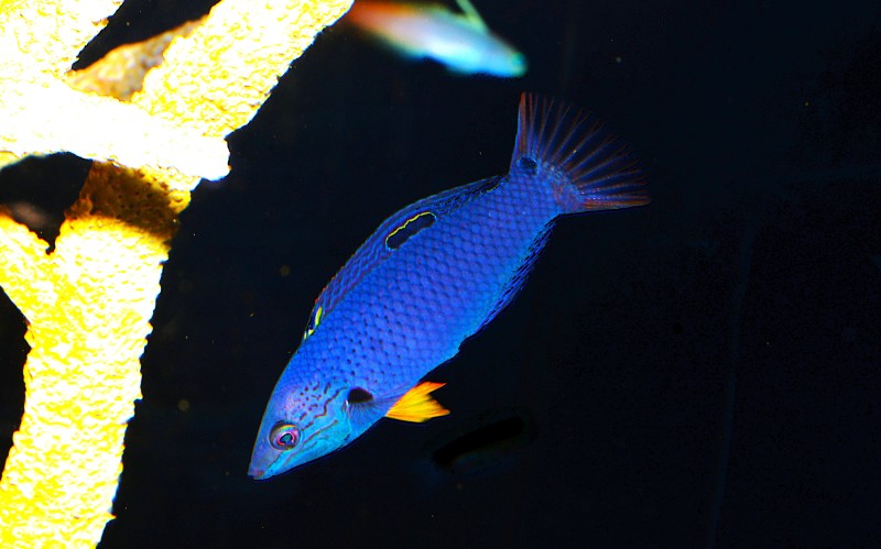 サンゴコーナーのシコロサンゴの展示されている水槽に同居しているツユベラです。小さい頃は二枚目の写真のようにオレンジ色と白色の鮮やかなツートンカラーでしたが、今では成長し写真のように白斑はほとんどなくなり、オレンジ色の体にはブルーの小さな斑紋が並び始めました。大人への変身の始まりです!