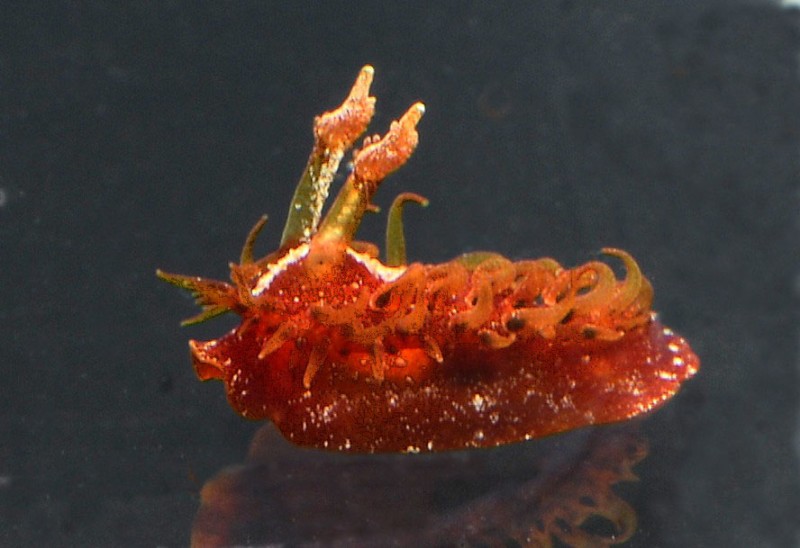 ウミウシコーナーに小型のウミウシたちが続々と展示されていますよ!今日紹介するショウジョウウミウシは体長1㎝程の小さなウミウシです。老眼の僕には、なかなかはっきりと見えないのですが、写真に撮ってみると何とカッコのいいウミウシなんでしょう。長く伸びた触角が素晴らしい!