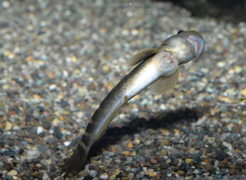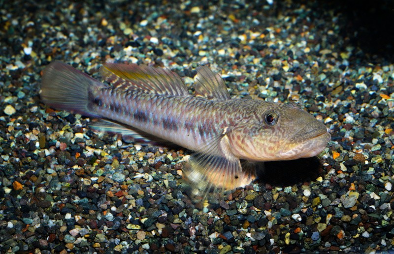 SATOUMI二階の、川の中流水槽でゴクラクハゼが立派な大人になっています。展示し始めた幼魚ころは二枚目の写真のようにシュッとした顔付でしたが、今は体長10は㎝を越え分厚い唇の厳つい顔になってしまいました。幼魚のころは河口近くの川で良く見られますが、成長すると純淡水域でも普通に見られるようになります。体の中央を走るブルーの斑紋の列が綺麗ですね。