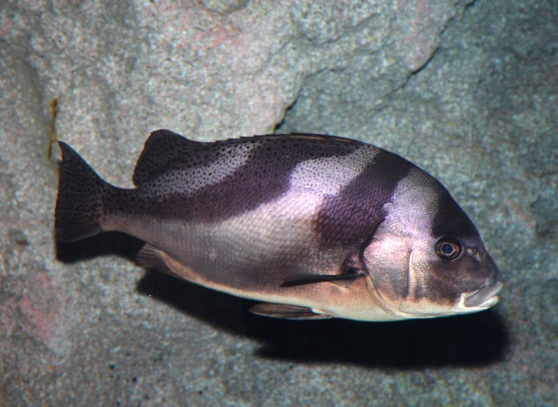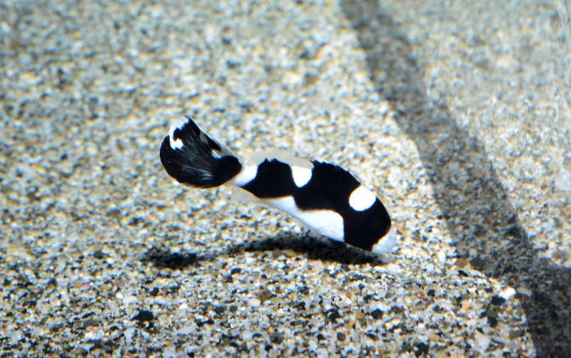 竜串湾大水槽で目立つ一匹、今朝はアジアコショウダイです。50㎝程の成魚で、唇が赤褐色をしているので良く目立ちます。写真はちょうど口を開けた瞬間で、その唇が何か餌を食べているようにも見えますね。子どものころは二枚目の写真のように白と黒のツートンカラーで、頭を下にして体をクネクネと動かします。成長に従い白色は無くなり体中細かい黒斑で覆われます。結構目立つので、出会ったら写真に収めてください!