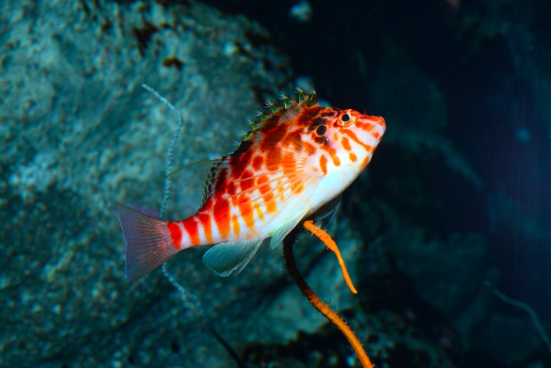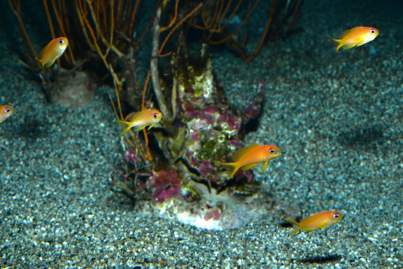 サンゴコーナーに入ってすぐの水槽に、オレンジ色の小さな金魚のような魚たちが群れています。キンギョハナダイの幼魚たちです。ほんとに可愛らしく金魚すくいのキンギョのようです。大きな眼が印象的ですね。写真をようく見ると、下から二番目の個体、口を大きく開けて、鰭を目一杯広げているんです!