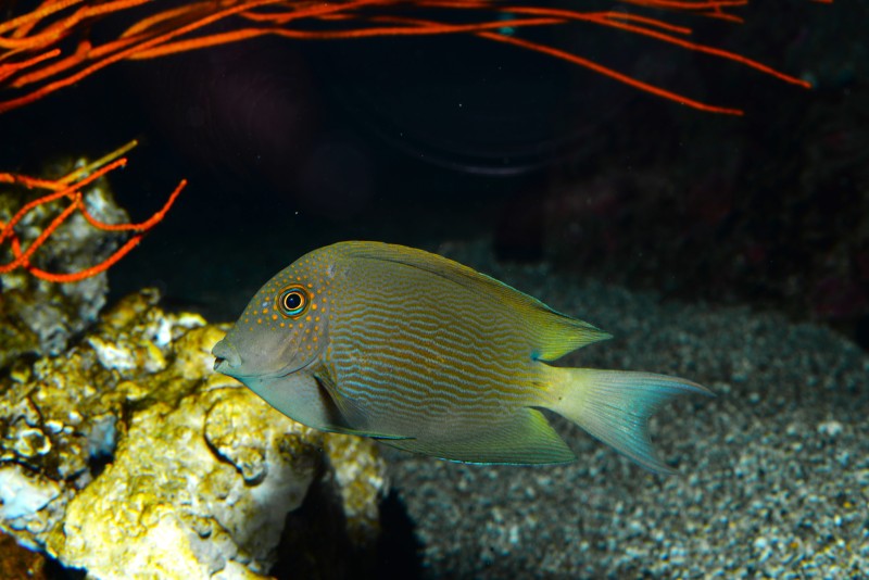 先日紹介したクダゴンベと同じ水槽のサザナミハギでの綺麗な写真が撮れました!目の周りのオレンジ色のスポット、身体に走るサザナミ模様がとても綺麗です。名前に「ハギ」とつくとカワハギの仲間のように思えますが、二ザダイの仲間です。その証拠に尾鰭の付け根近くに鋭いトゲを隠し持っているんです。
