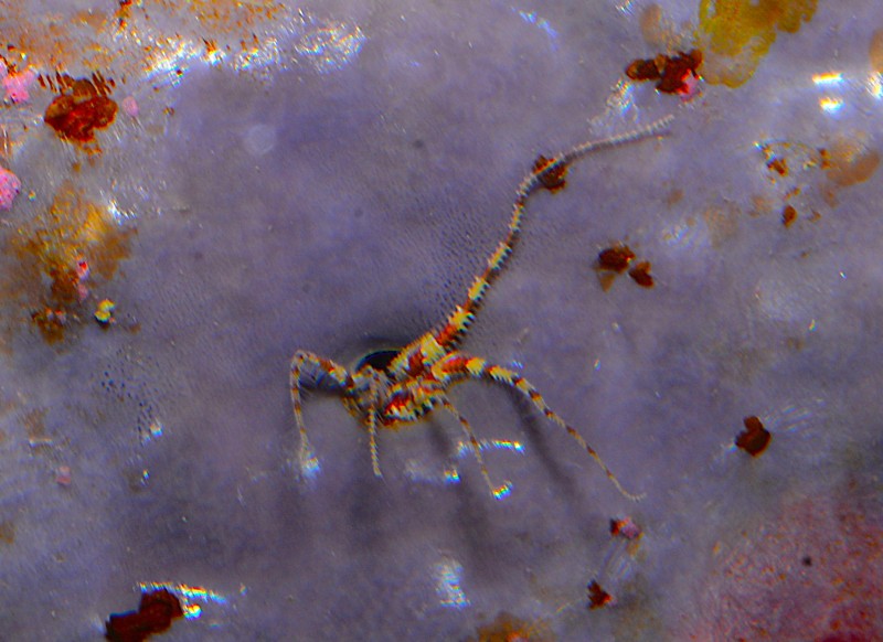 不思議な写真が撮れました。アクリル観覧面の前にいたので接写でパチリ!熱帯の珊瑚礁の海に沢山の島が散らばっているよう。なんだと思いますか?先日紹介した脱皮をして綺麗な体になった、ニシキエビの頭胸部のアップです。マクロにしてみると面白い写真が撮れますね。頭胸部全体の写真は2枚目ですよ。